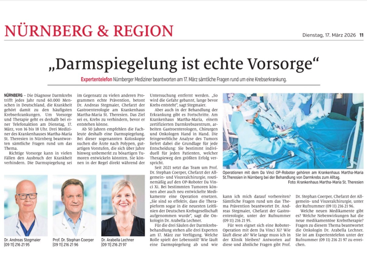 Die Nürnberger Nachrichten und die Nürnberger Zeitung berichten aktuell über die moderne Darmkrebstherapie an unserem zertifizierten Darmkrebszentrum.